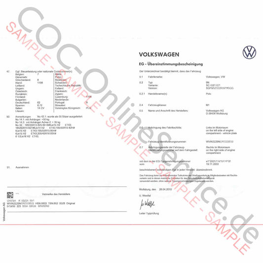 Document COC pour VW Volkswagen (Certificat de Conformité)