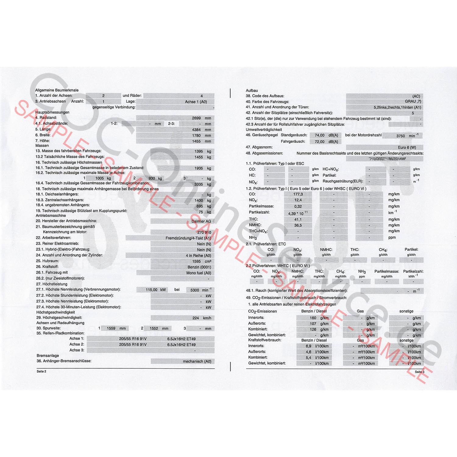 ATTENZIONE: Per i veicoli commerciali (Vito, Viano, Vaneo, Citan, Classe V, Sprinter, Classe X, Classe G e Classe T), la produzione del duplicato del COC può richiedere fino a 6 settimane. Per i veicoli con omologazione di tipo a più fasi, solitamente possiamo fornire solo la prima fase del documento COC.