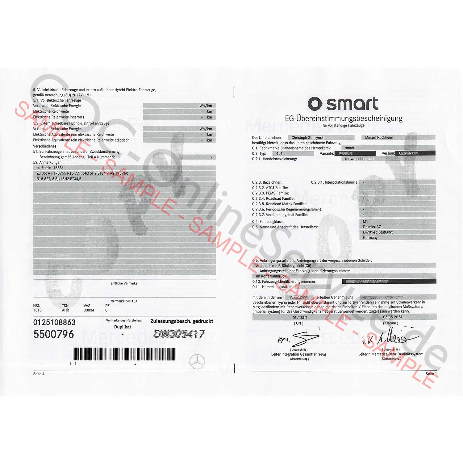 Po utworzeniu dokumentu przez producenta pojazdu otrzymają Państwo e-mail z wersją PDF swojego COC. Dzięki tej kopii można często zarejestrować pojazd lub przeprowadzić badanie techniczne. Oryginał dokumentu zostanie następnie przesłany pocztą tradycyjną lub przesyłką ekspresową.