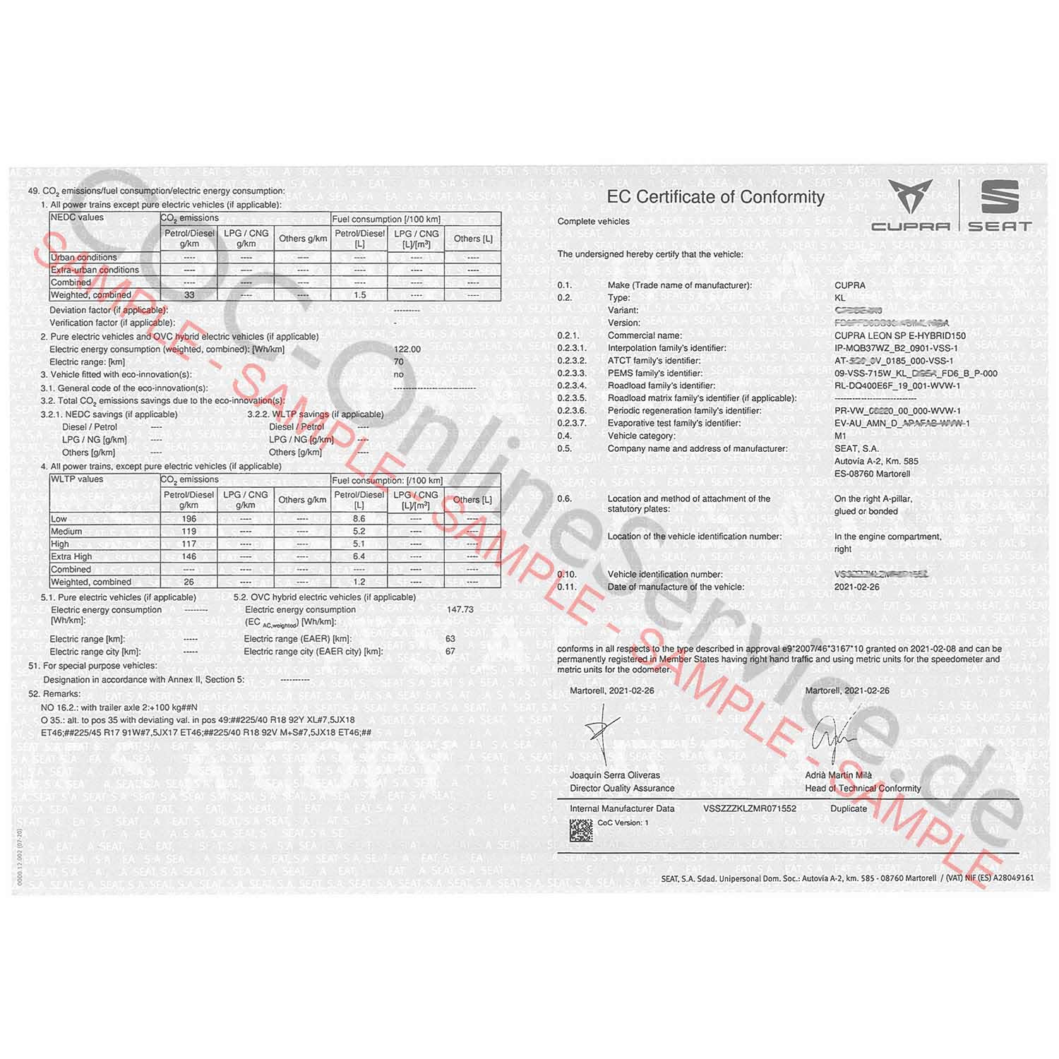 Adquire um certificado de conformidade SEAT (COC) autêntico, emitido pelo fabricante SEAT, que atesta a conformidade do seu veículo com as normas europeias. Com este documento COC, poderá registar o seu veículo oficialmente em todos os países do Espaço Económico Europeu (EEE).